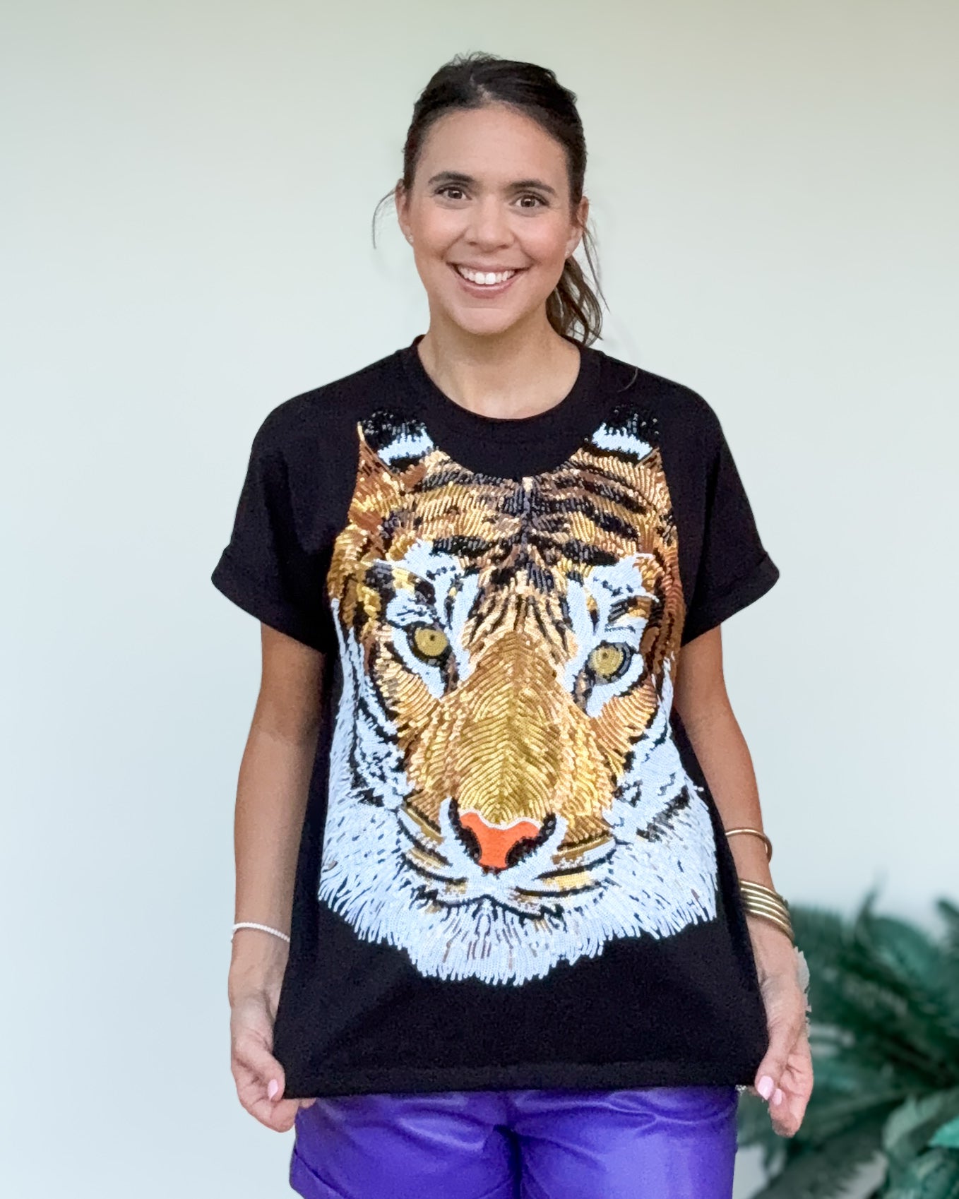 Callin' all tiger fans! Our popular, full face tiger design is now available on our buttery soft cuff sleeve tee!