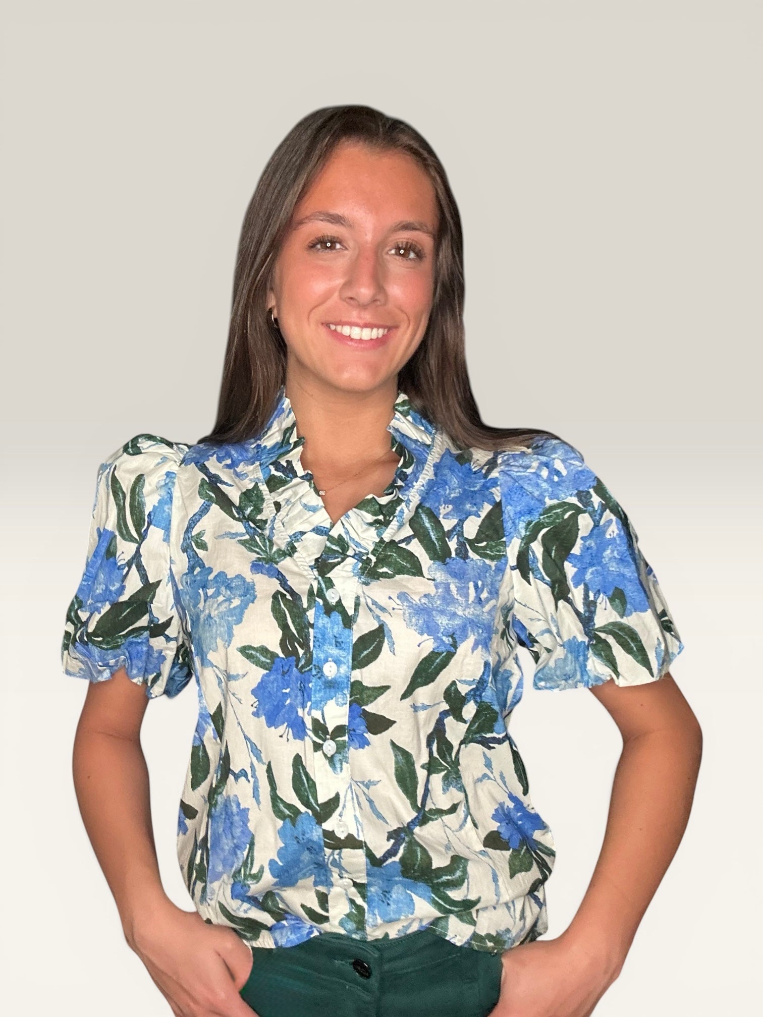 Sweet, feminine, and effortlessly charming. This floral print woven top features short puff sleeves and a ruffled V-neck collar for a romantic touch. Designed with a full button-front closure and crafted from 100% cotton, it’s lightweight, breathable, and perfect for warm-weather days. Easy to dress up with trousers or keep casual with your favorite denim.
