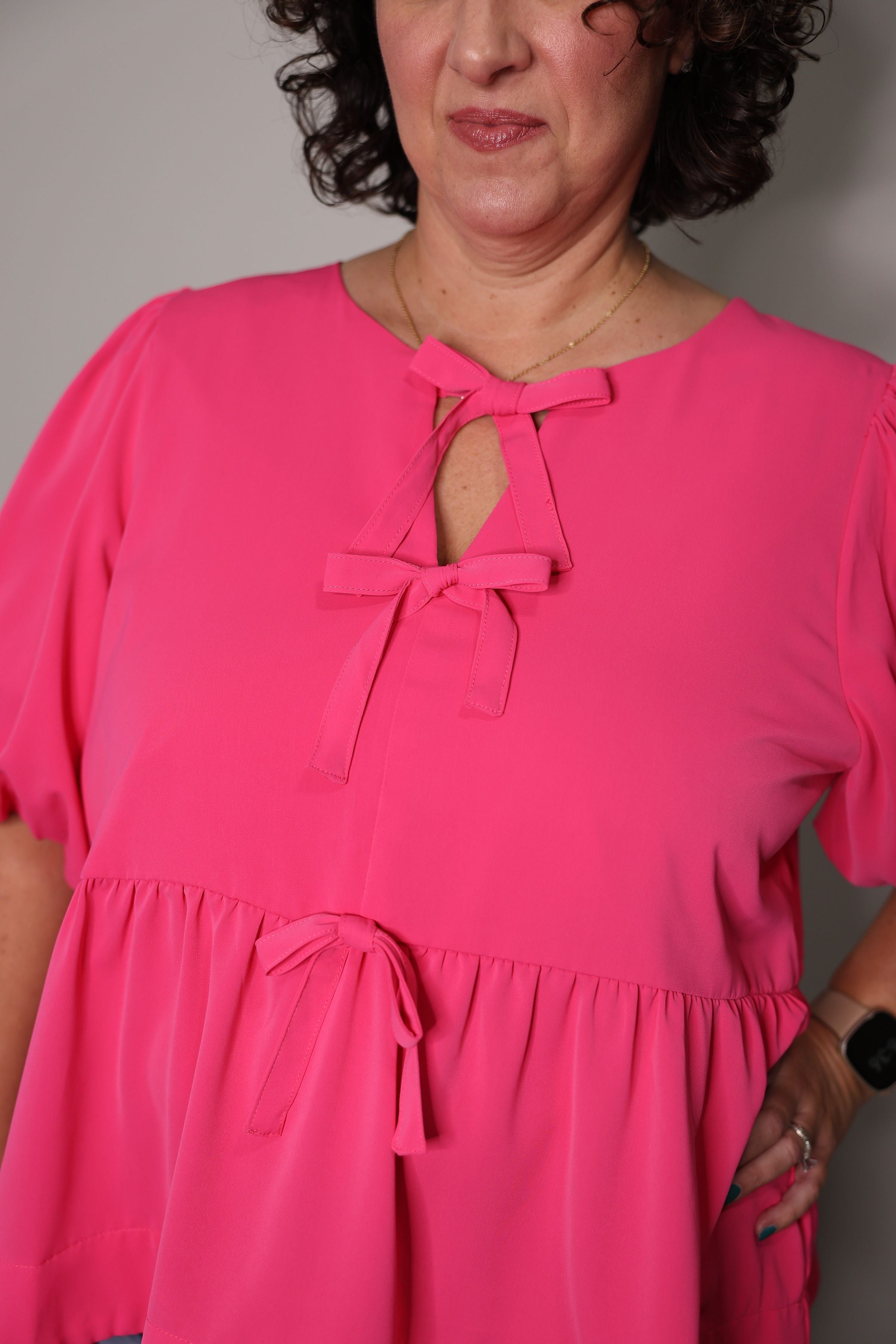 Solid short puff sleeve peplum top featuring self-tie bow detail at front. Unlined. Woven. Non-sheer. Lightweight.