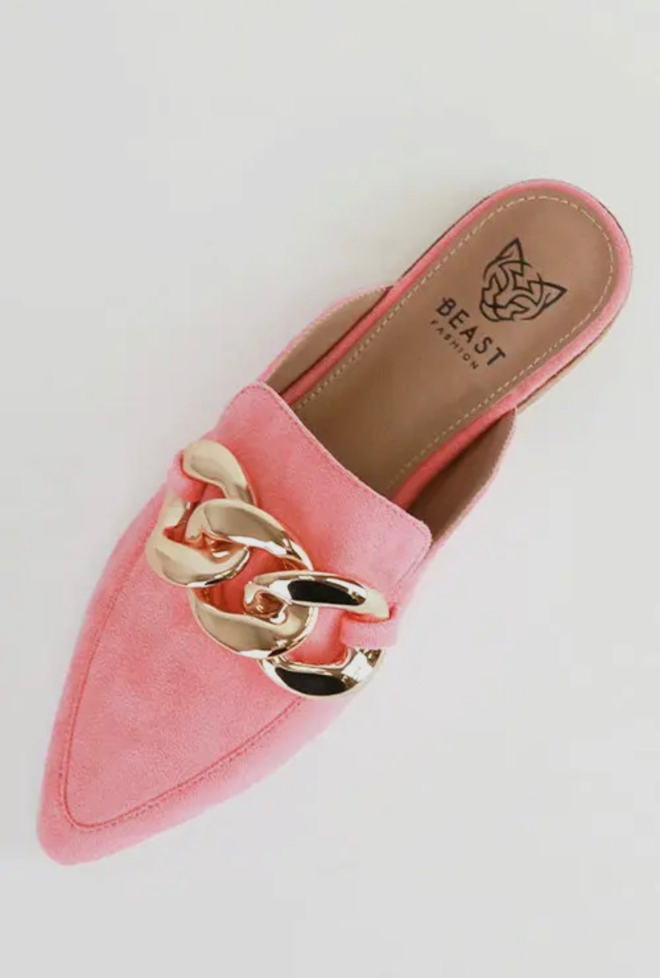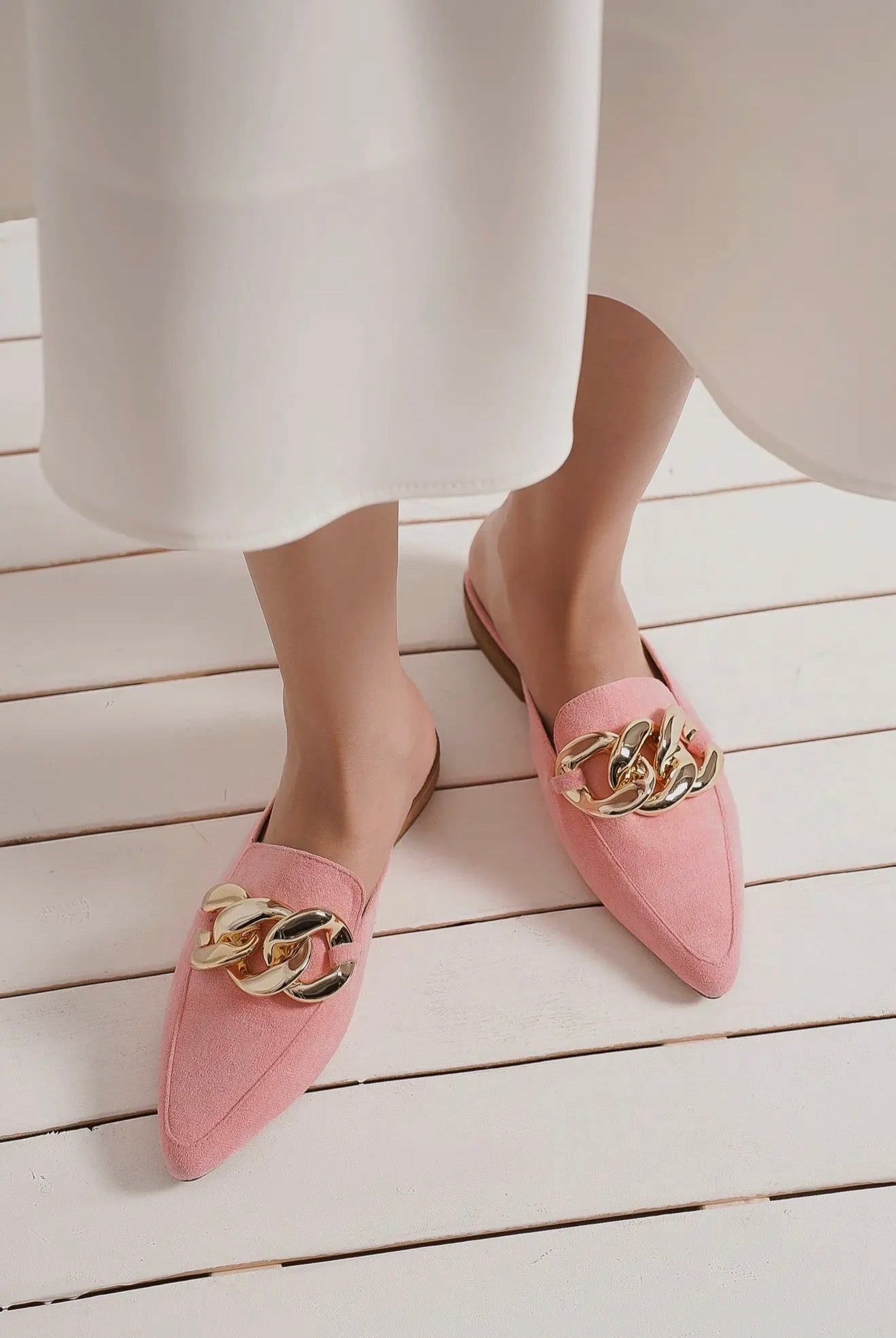 Step into sophistication with the Lennox Chain Detail Mule — where bold meets timeless elegance. This slip-on style features a sleek pointed toe and a striking gold-tone chain accent that adds just the right touch of statement shine. Crafted in soft faux suede, the design offers effortless comfort with a low 0.75” heel and a true-to-size fit. Perfect for elevating any look, from tailored trousers to denim or dresses, these mules bring instant polish and poise to your everyday style.